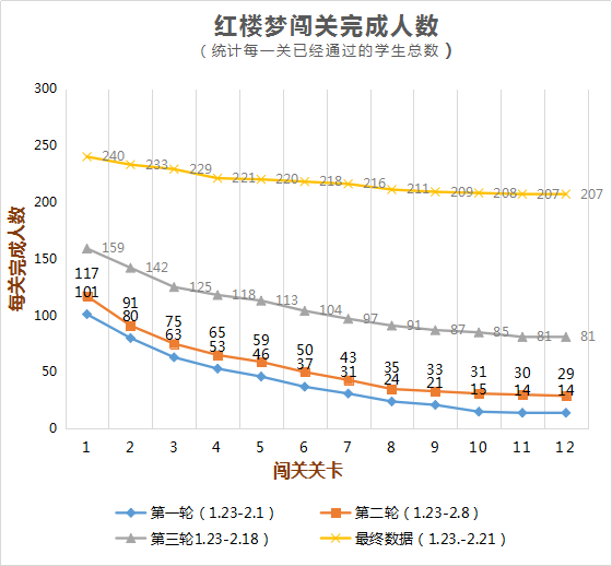£¨1£©Í¨¹ØÈËÊý£º±¾´Î´³¹Ø»î¶¯¹²ÓÐ12¹Ø£¬ÆäÖеÚÒ»¹ØÍ¨¹ýÈËÊýΪ240ÈË£¬µÚ¶þ¹ØÍ¨¹ýÈËÊýΪ233ÈË£¬Ëæ×Źؿ¨Ôö¼Óͨ¹ýÈËÊýÖð½¥¼õÉÙ£¬Ê®¶þ¹ØÈ«²¿Í¨¹ØÈËÊýΪ207ÈË£¬±¾´Î»î¶¯¹²½øÐÐËÄ´ÎÊý¾Ýͳ¼Æ£¬¾ßÌåʱ¼ä¶Îͨ¹ØÊý¾ÝÈçÏÂ±í£º