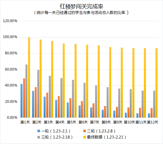 ±¾´Î¡¶ºìÂ¥ÃΡ·Õû±¾ÊéÔĶÁ´³¹Ø»î¶¯Àúʱһ¸öÔ£¨1ÔÂ23ÈÕ-2ÔÂ21ÈÕ£©£¬»î¶¯¹²ÑûÇëÉϺ£ÊÐ74Ëù¸ßÖÐУ²ÎÓëÆäÖУ¬»î¶¯Æ½Ì¨·ÃÎÊÖµ¹²4328513´Î£¬´³¹Øµã²ÎÓë×ÜÈË´ÎΪ123990£¬»î¶¯±¨ÃûÈËÊý¹²23361ÈË£¬ÆäÖÐÓÐ15776ÃûѧÉú²ÎÓëÁË´³¹Ø£¬È«²¿Í¨¹ØÑ§Éú´ï12625ÈË¡£