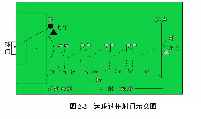 1、考试方法:如图2-2所示,从罚球区线中点垂直向场内延伸至20米处,画一条平行于球门线的横线作为起点线。距罚球区线2米处起,沿20米垂线共插置8根标志杆。考生将球置于2米长的起点线标志杆正后方上,运球依次绕过8根标志杆后起脚射门,球动开表,当球从空中或地面越过球门线时停表,记录完成的时间。凡出现漏杆、射门偏出球门,球击中横梁或立柱弹出,均属无效,不计成绩。每人测试2次,取最好成绩。