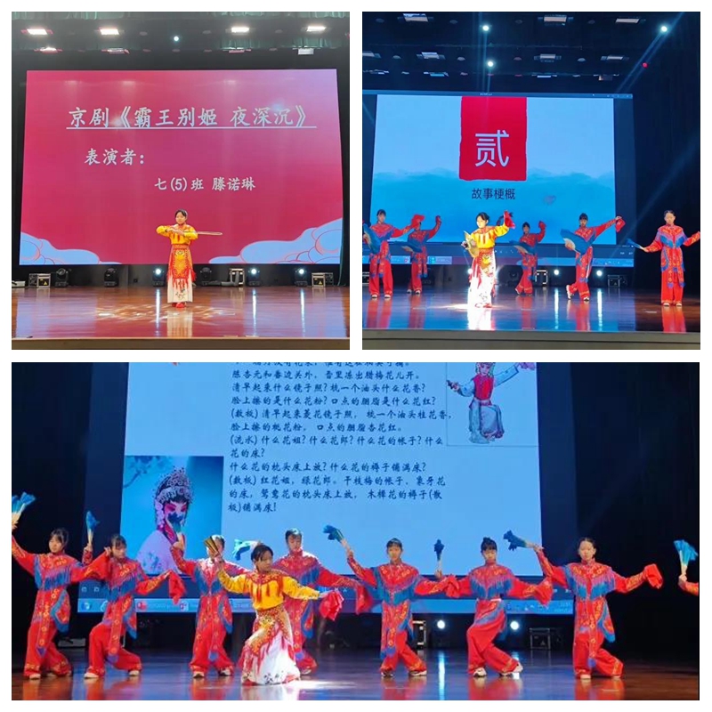 《霸王别姬 夜深沉》、《卖水》又被称为东方歌剧的国粹——京剧,舞台上的七年级小演员们活泼开朗,顾盼神飞,举手投足间都彰显着中华传统之美。