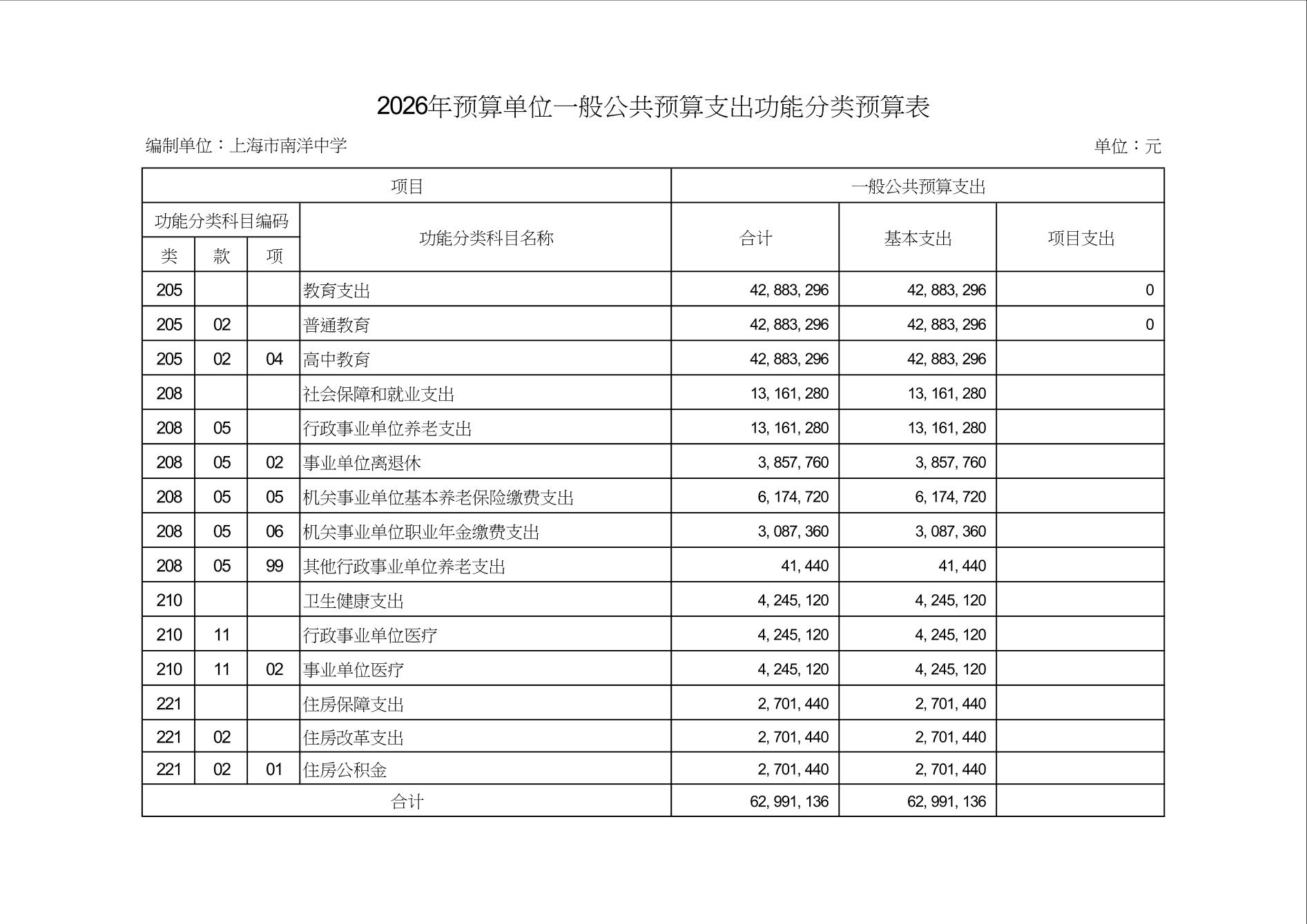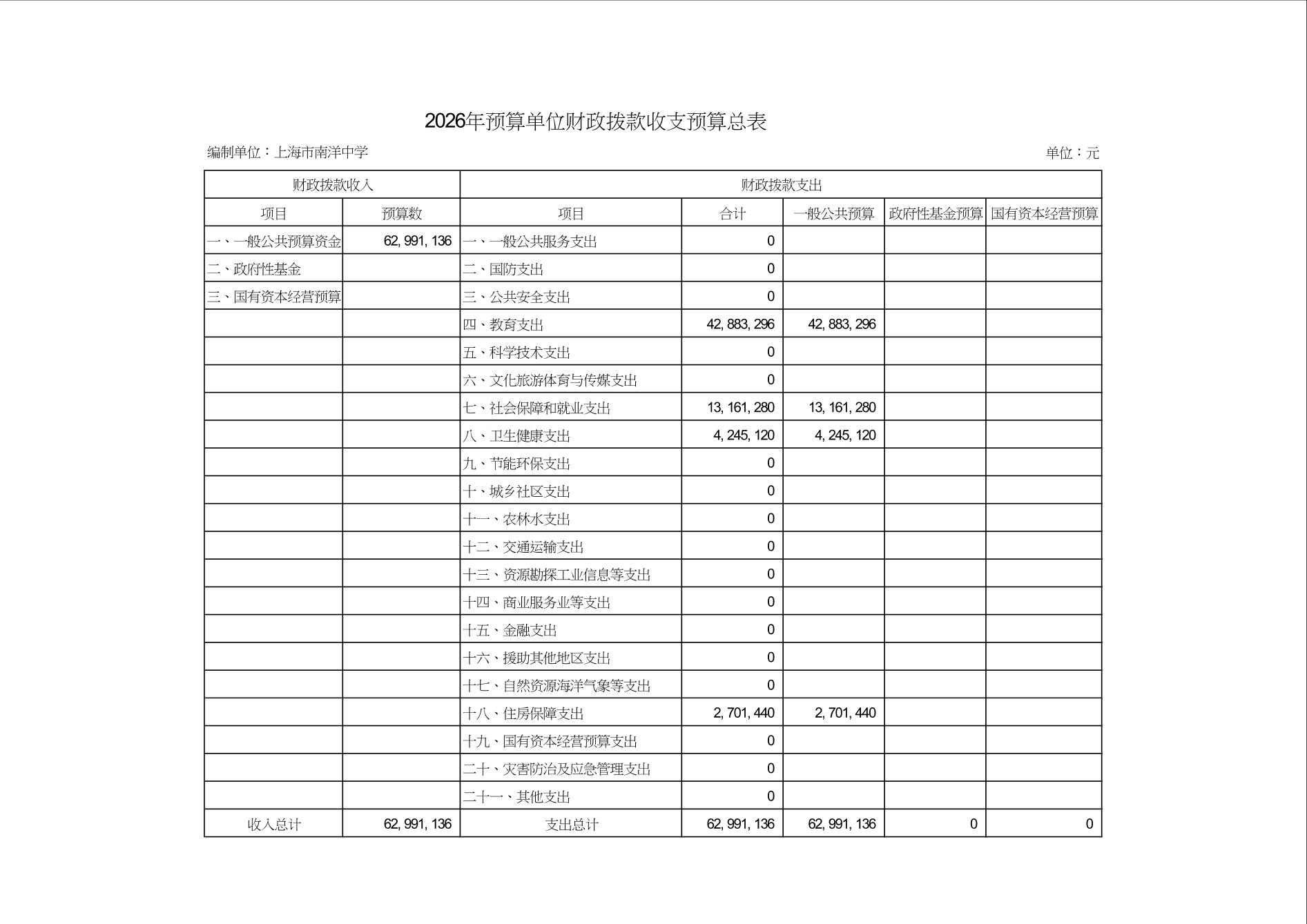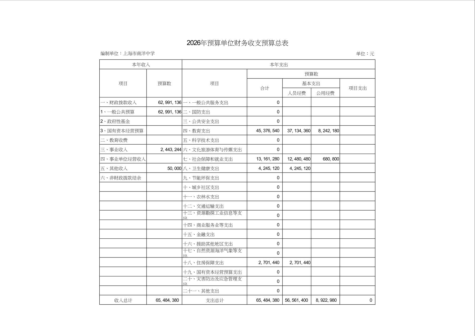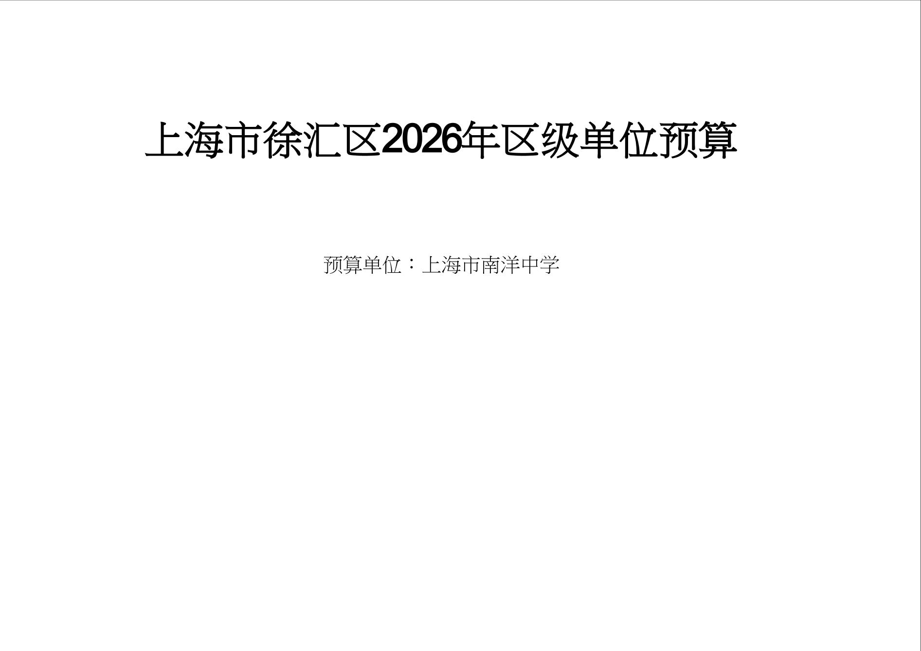 上海市南洋中学2026年度单位预算
