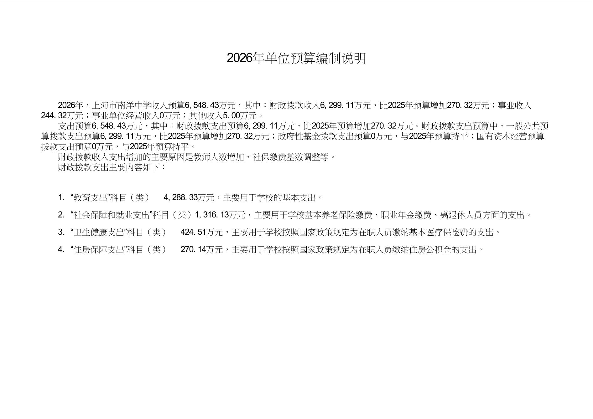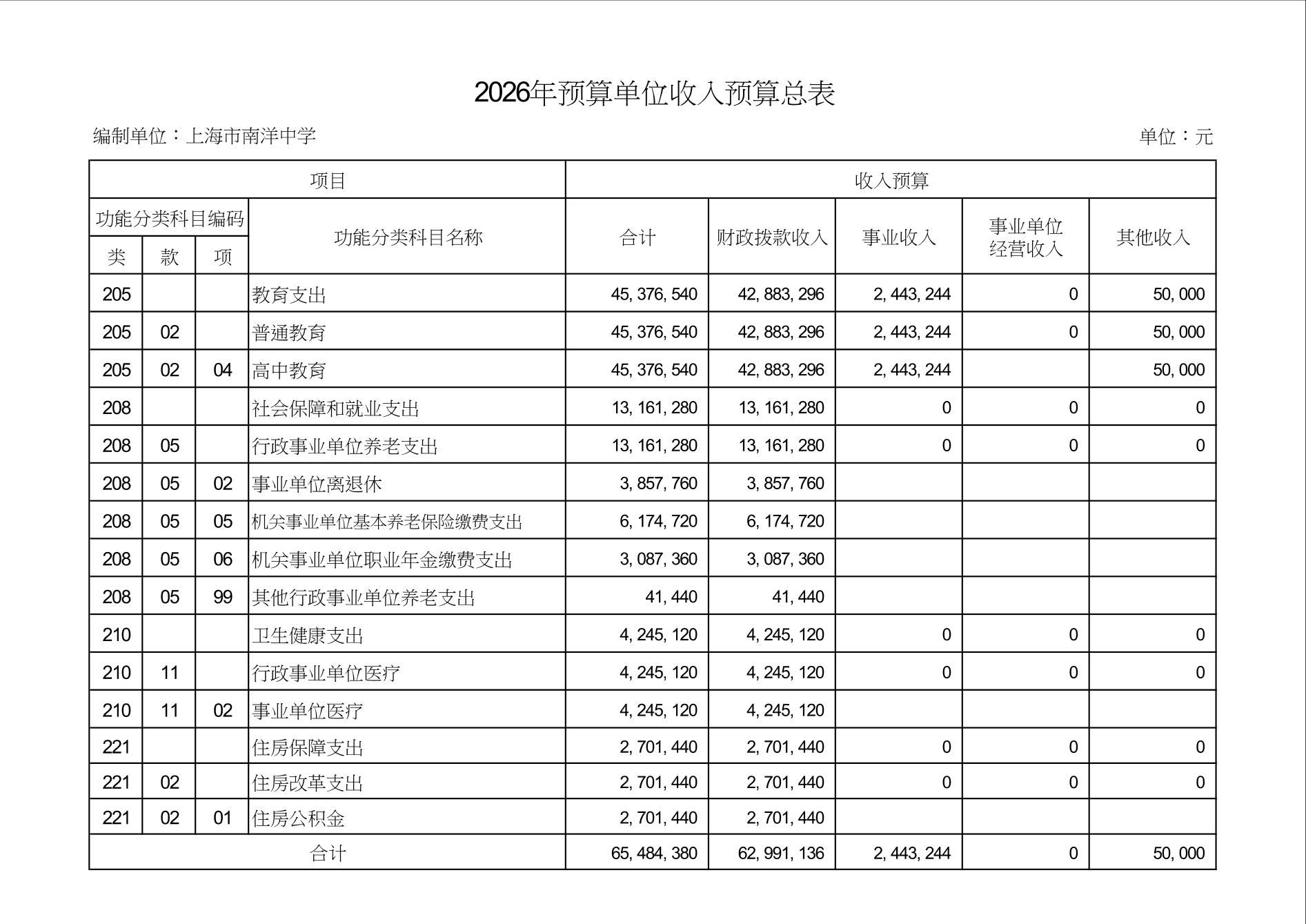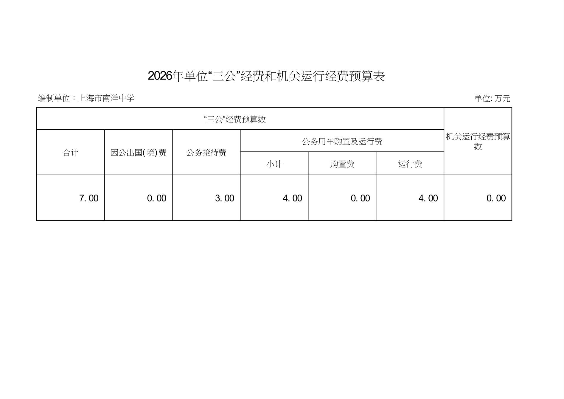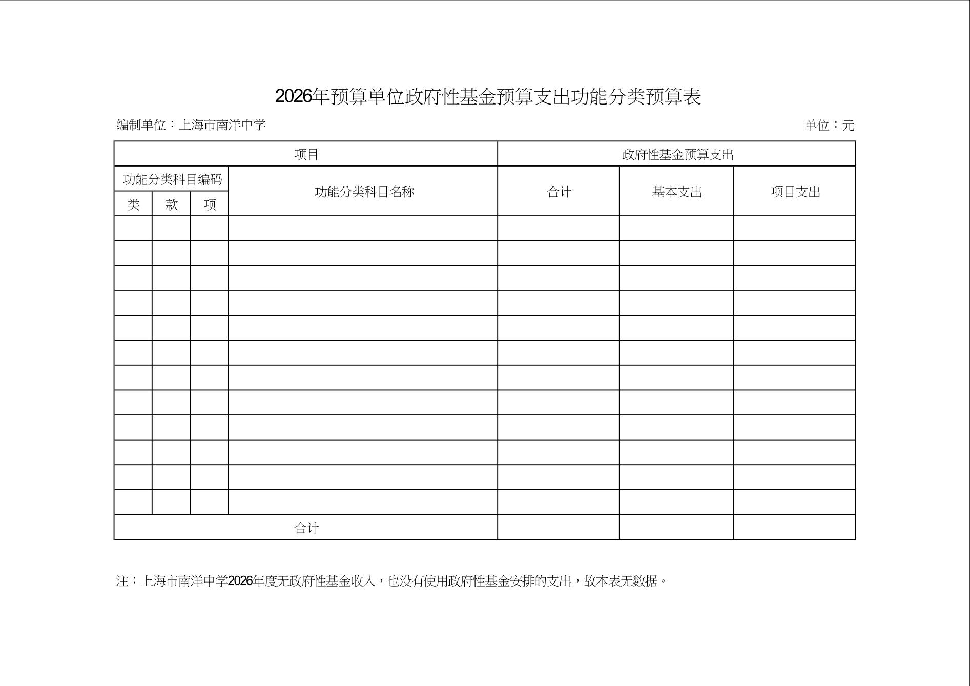 上海市南洋中学2026年度单位预算