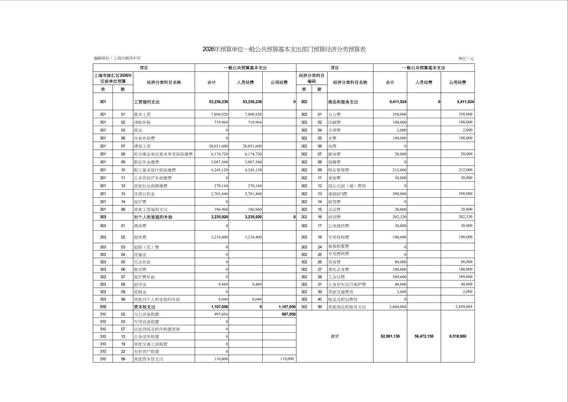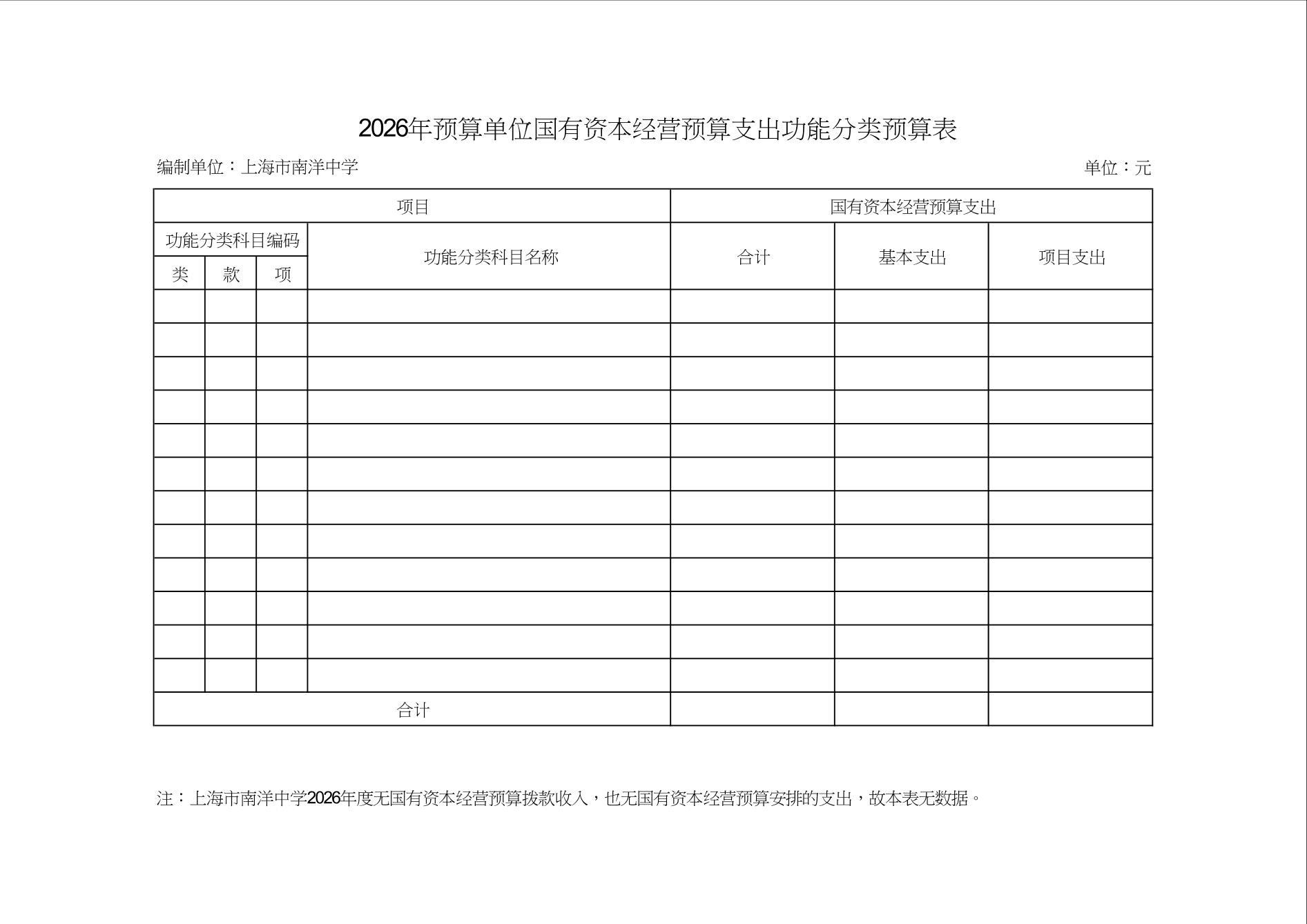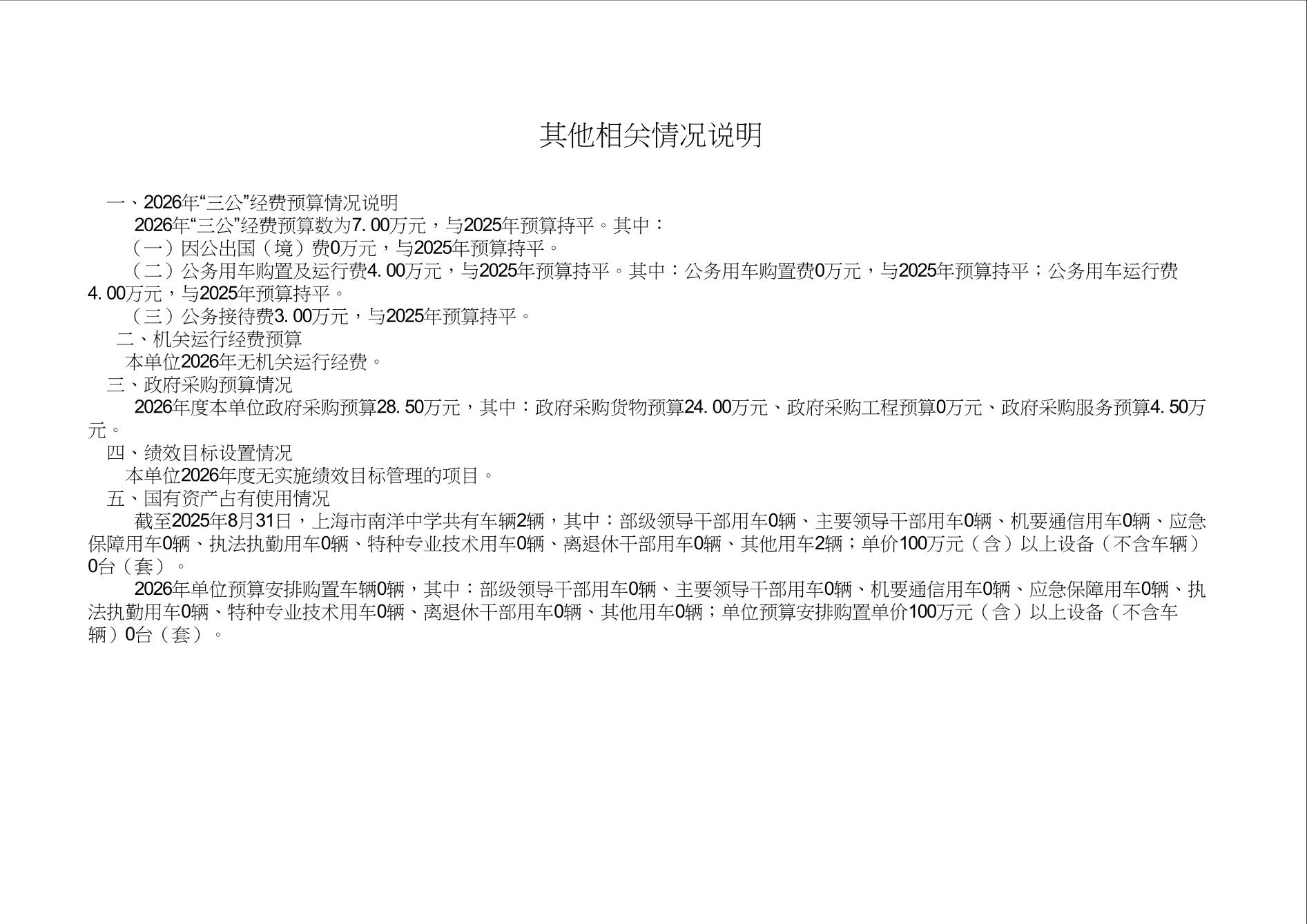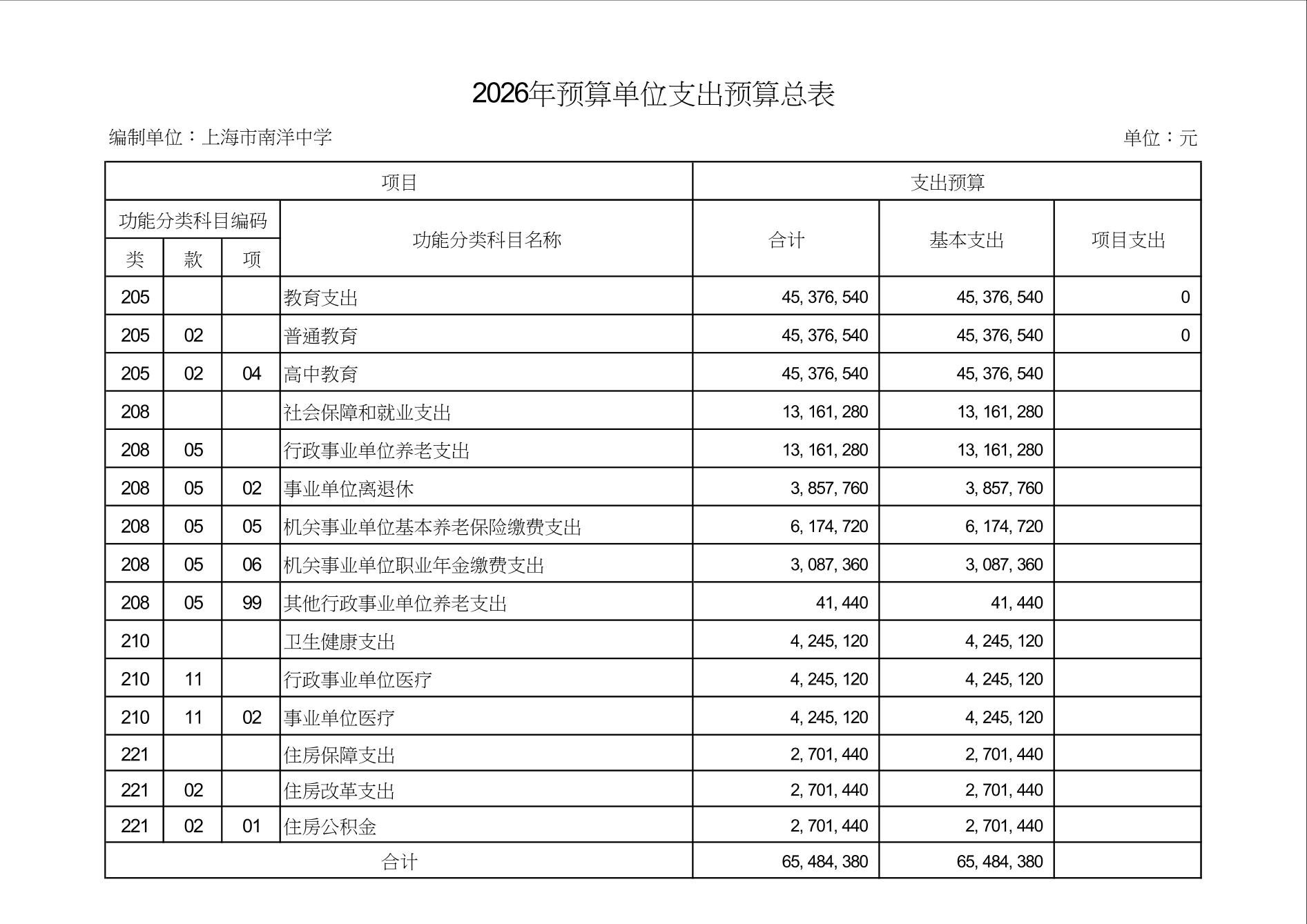 上海市南洋中学2026年度单位预算