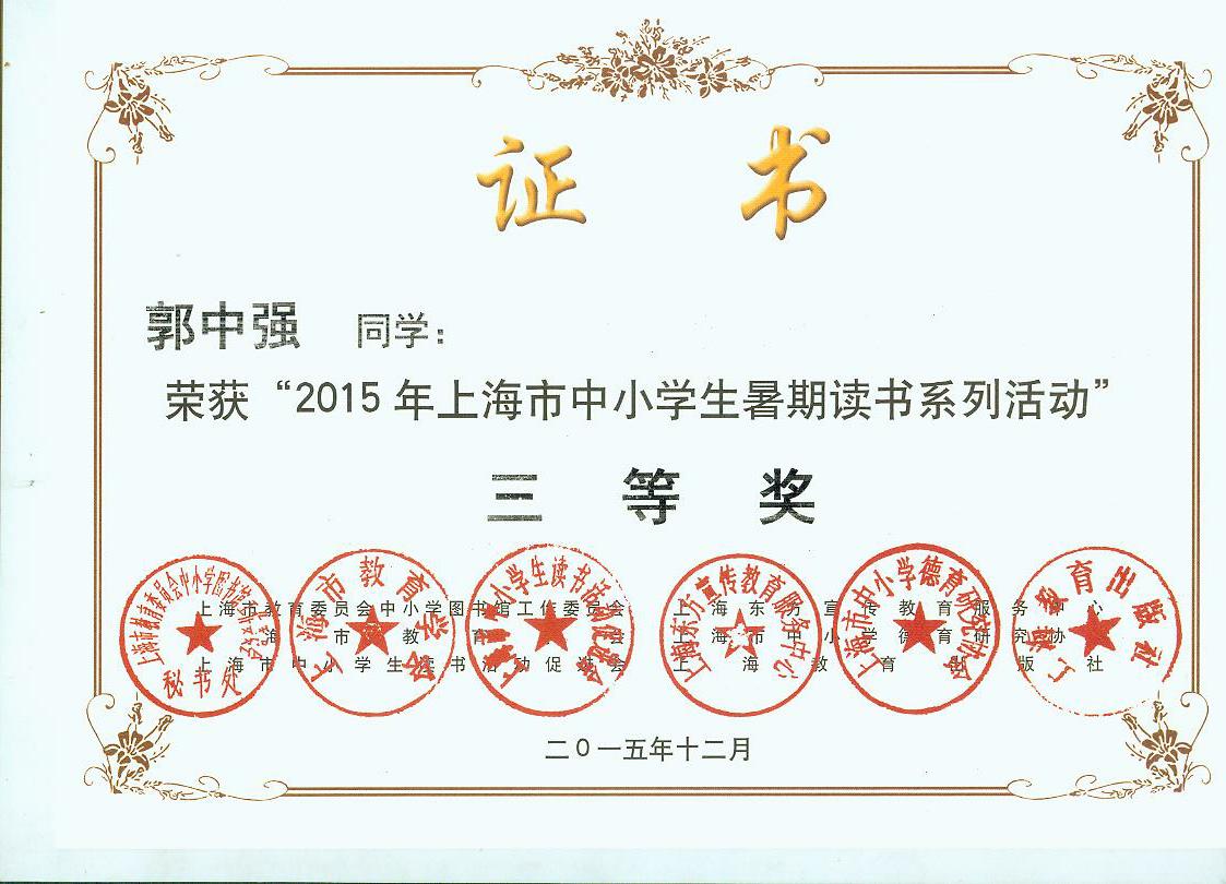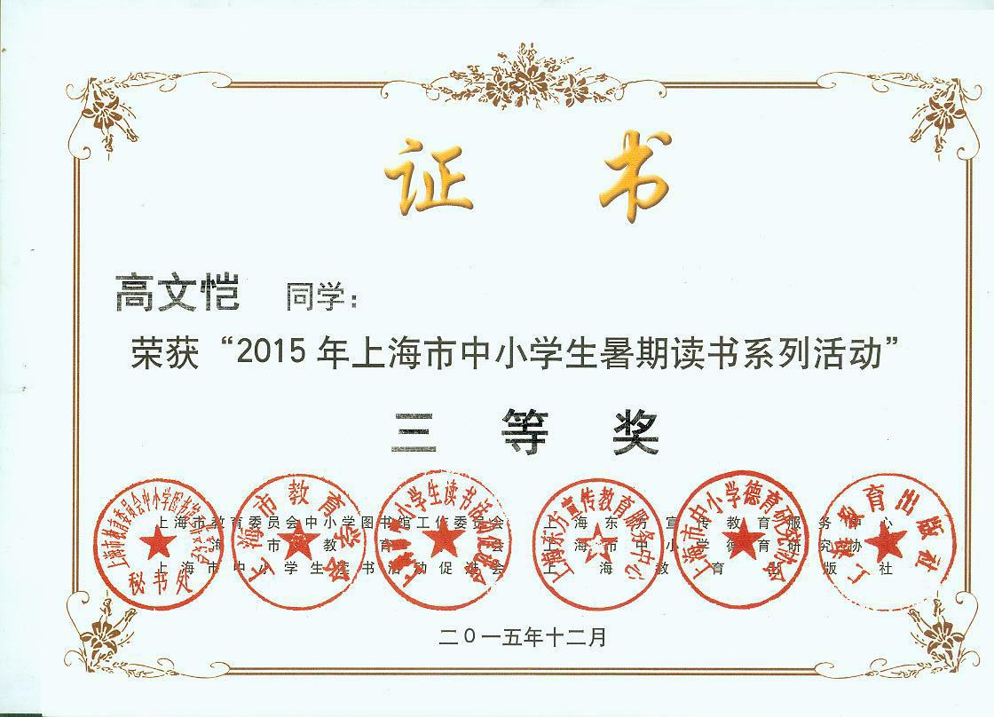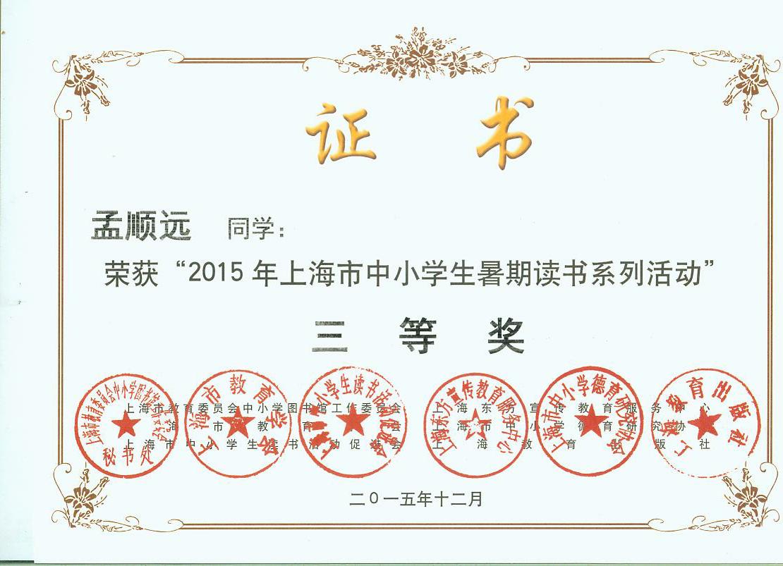 2015年暑期读书活动获市一、二等奖奖状