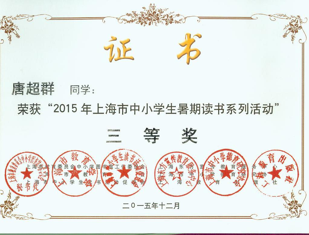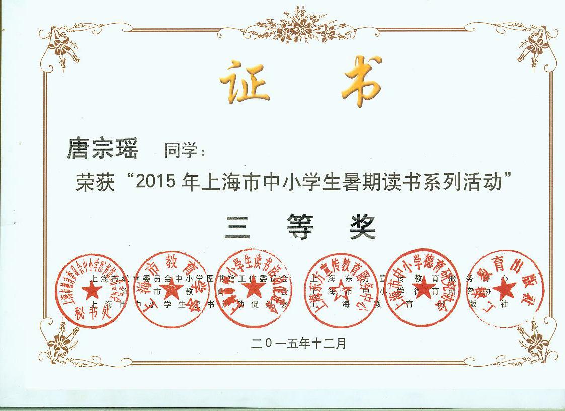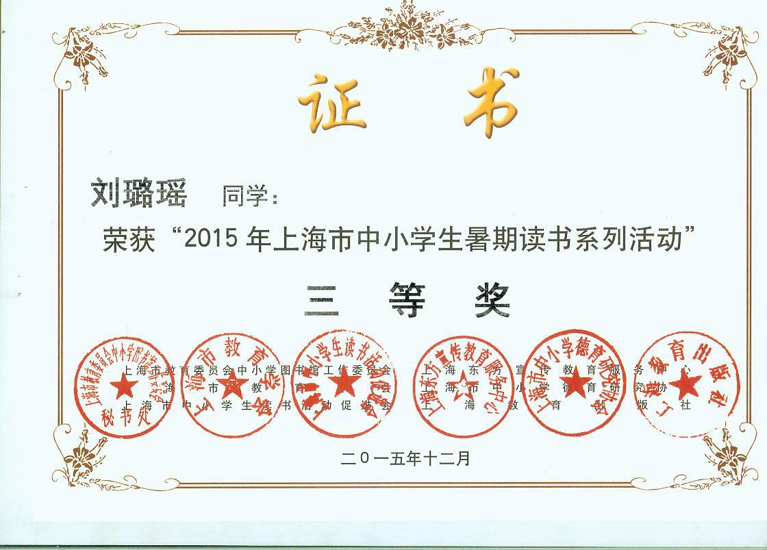 2015年暑期读书活动市三等奖奖状
