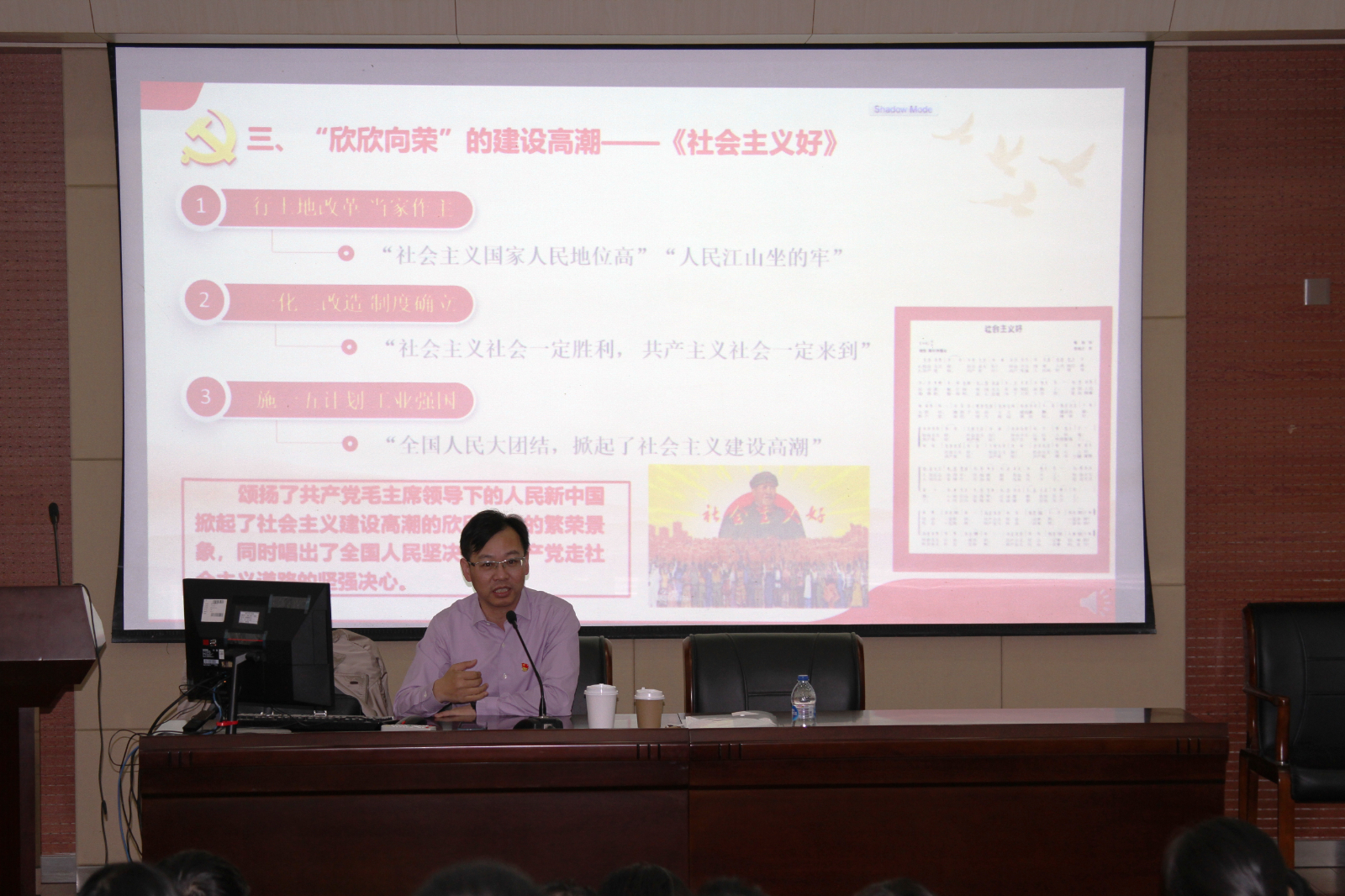 红色歌曲是革命实践的真实写照,歌曲跃动的是音符、奏响的是记忆、镌刻的是历史、传承的是精神。方老师分别从五首红色歌曲《义勇军进行曲》、《中国人民志愿军战歌》、《社会主义好》、《学习雷锋好榜样》和《东方红》入手,为全体党员老师详实地描绘了歌曲诞生的历史背景,揭示了歌词融涵的革命意象,助益教师们体会不同时代背景下,革命歌曲中蕴含的鼓舞人心的精神力量和建设美好祖国的壮阔情怀。