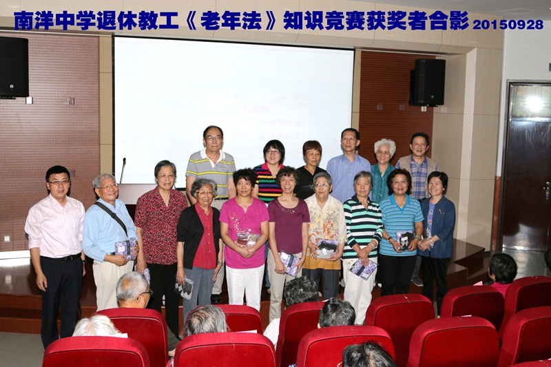 9月28日,退管会组织了退休教工返校日活动,会上,陆校长与全体与会退休教工见面并发表了热情洋溢的讲话,为今年80岁、70岁生日的老师祝寿,为获得南洋中学学习《老年人权益保障法》知识竞赛获奖的教工发奖,陪同退休教工参观南洋中学新校园,参观南洋中学新建成的百年碑廊等。