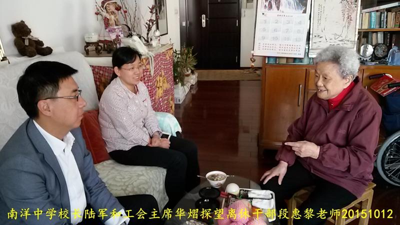 南洋中学退管会非常重视、关心、帮困离退休教工,陆校长心系老教师,传承好传统,专程探望了学校离休干部姚民定老师和段惠黎老师,亲临患病的学校退休党政干部乔界文老师的家中,送去党组织和学校对他们的关怀。