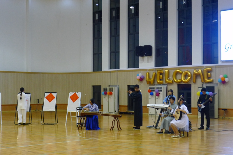 晚上七点三十分,南洋赛区的四国文艺联欢会正式开场,我们也有幸邀请到了徐汇区华侨联合会的主席张惠珍女士和南洋中学的陆军校长与周英儁副校长共同度过这个令人难忘的夜晚。南洋中学的学生们为四支球队的运动员和随行人员精心准备了傣族舞蹈、空竹互动、民乐欣赏、书法猜字、太极体验等联欢活动,顿时间欢呼声和掌声回荡在席间。当然让人眼前一亮的,还有泰国队伍为大家带来的泰拳表演,当泰国功夫与中国的太极相遇,自然也有了别样的味道。中国福建厦门二中队员带来的歌曲串烧最终将文艺联欢带入高潮,一首“We will rock you”嗨翻全场,一瞬间所有观众冲向篮球馆舞台共同手舞足蹈,跟着音乐声打起节拍、跳起街舞。这个夜晚开始让我们相信,就像音乐没有国界一样,体育运动也可以跨越国界。