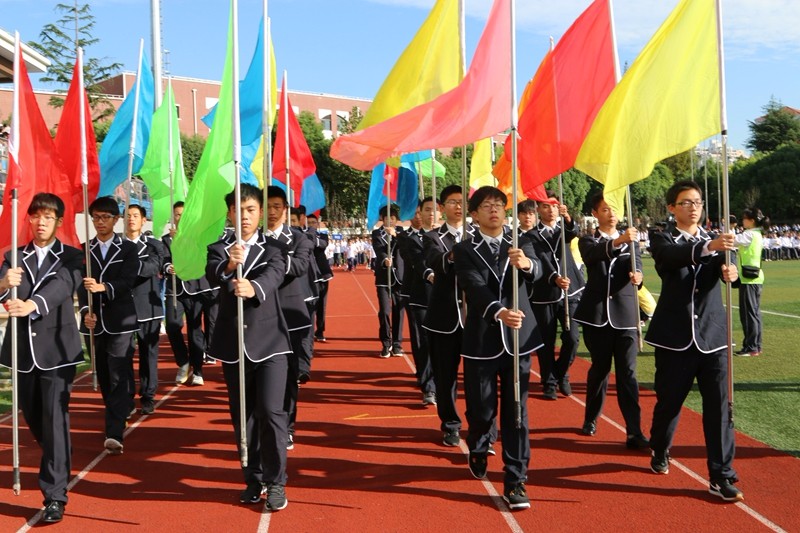 2017年9月29日,南洋中学初中、高中全体师生在田径场上共同举行了2017年田径运动会暨科技艺术节开幕式。在入场式表演中,随着国旗队、校旗队、会旗队、鲜花队、彩旗队的先后入场,体育方队、科技方队也为我们展现了他们的科技创新的精神和运动竞技的魅力。各年级的方阵队伍总是百花争艳、各具特色,他们充满朝气与活力,踏着轻盈的步伐,有的年级用KT版展现年级的口号,有的年级跳起集体舞,展现团结奋进的精神面貌,他们青春飞扬,活力的色彩在这里绽放。