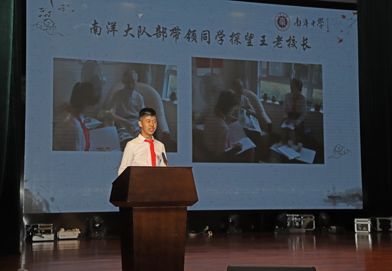 为了积极响应习近平主席希望少年儿童“热爱党、热爱祖国、热爱人民,用实际行动把红色基因一代代传下去”的号召, 2019年6月,在高中团委、初中大队部的组织下,初、高中师生代表走访了南洋中学离休教师段惠黎、南洋初级中学退休教师梁友义、南洋初级中学离休老校长王钟麟、南洋中学杰出校友朱鸿兴四位老南洋人。在今天这个特殊的开学典礼上,采访团队的四位同学作为讲述人,用字字句句采访的故事和感受,讲述了老一辈革命家,为革命事业付出的心血,为新中国成立所付出的努力,以及老一辈革命家对我们南洋学子的寄语和嘱托,无不让在场的师生心生敬佩,也深受洗礼。