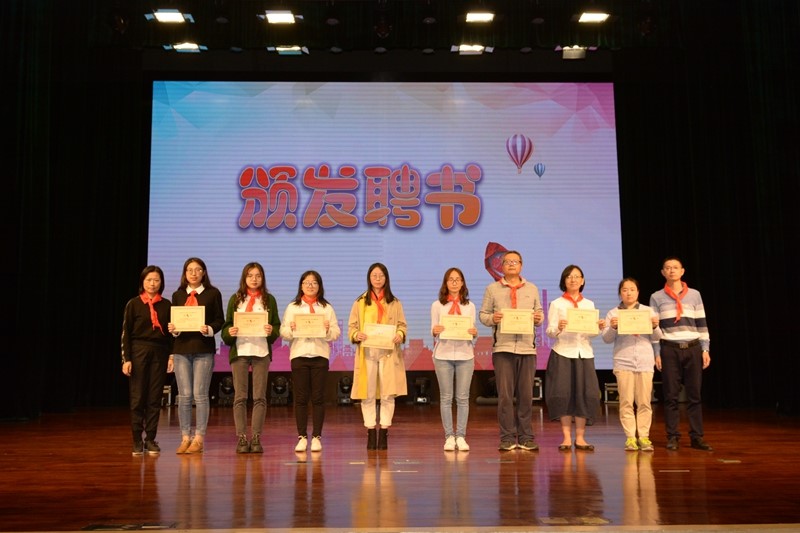 在护旗手的护送下、在全体队员的注视中,鲜红的队旗来到礼堂中央,队歌响彻四方,仪式就此开始。首先进行的是庄严的建队仪式。当大队辅导员施老师宣读中队成立决定及聘任辅导员名单后,中队长为辅导员献上红领巾,表达对辅导员的谢意和敬意。范校长、党支部书记黄老师也在《红领巾之歌》铿锵有力的歌声中为中队辅导员颁发聘书。这是对每一位辅导员老师的认可和期许!