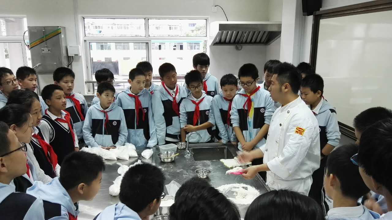 到达目的地后,学生被分成四批分别体验中西烹饪、中西点实训和冷盘食品雕刻中的两项课程。平时孩子们都没机会接触到和烹饪有关的事物,因而面对烹饪老师的技巧和刀工,孩子们都赞叹不已。与此同时香气四溢的菜品也征服了孩子们的味蕾,上课老师展示完毕后,终于轮到同学们大显身手了,孩子们跃跃欲试开始尝试包水饺,但那些看上去很简单的步骤比如擀面皮、调馅等,其实暗藏着大学问。一开始的尝试或许不是那么顺利,但是在老师和其他同组同学的共同协作下,一个个小艺术品成形了,看着自己的杰作孩子们也开怀的笑了。雕花拼盘组的孩子们也体会了别具一格的一课,在课上他们尝试了用小番茄雕刻成兔子的形状,个个栩栩如生,玲珑可爱。