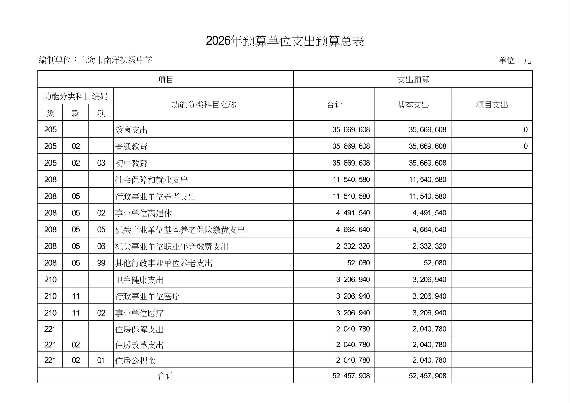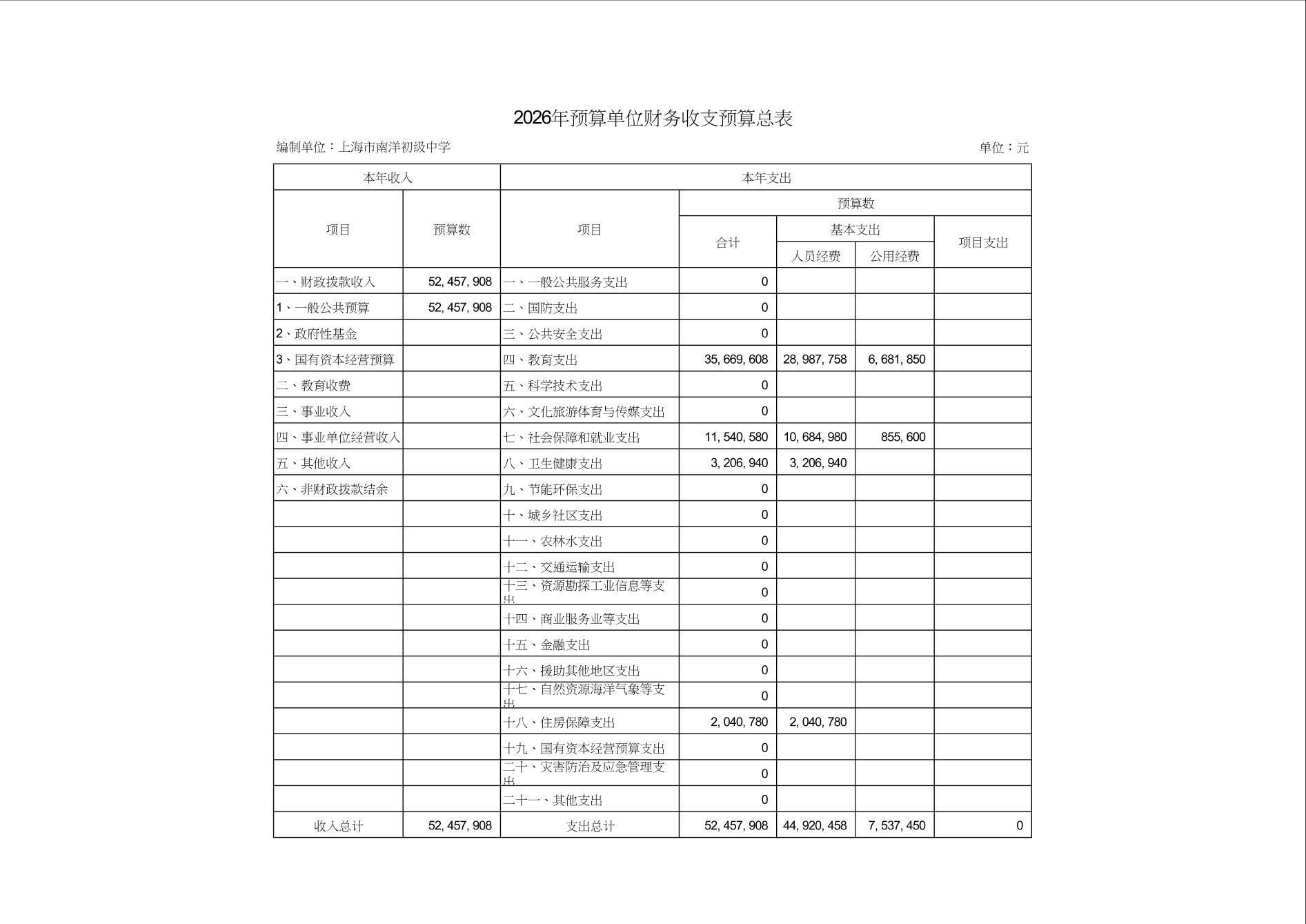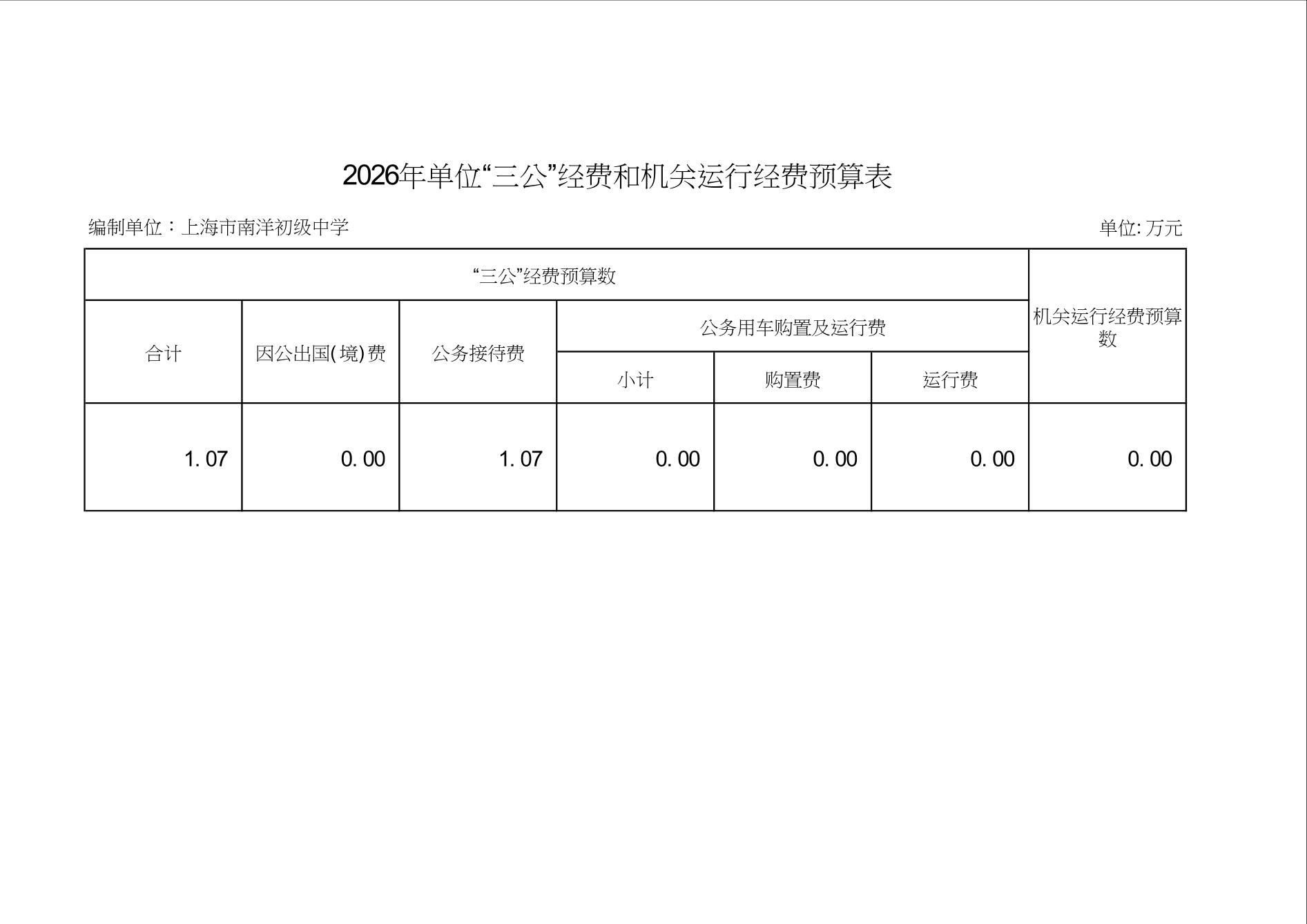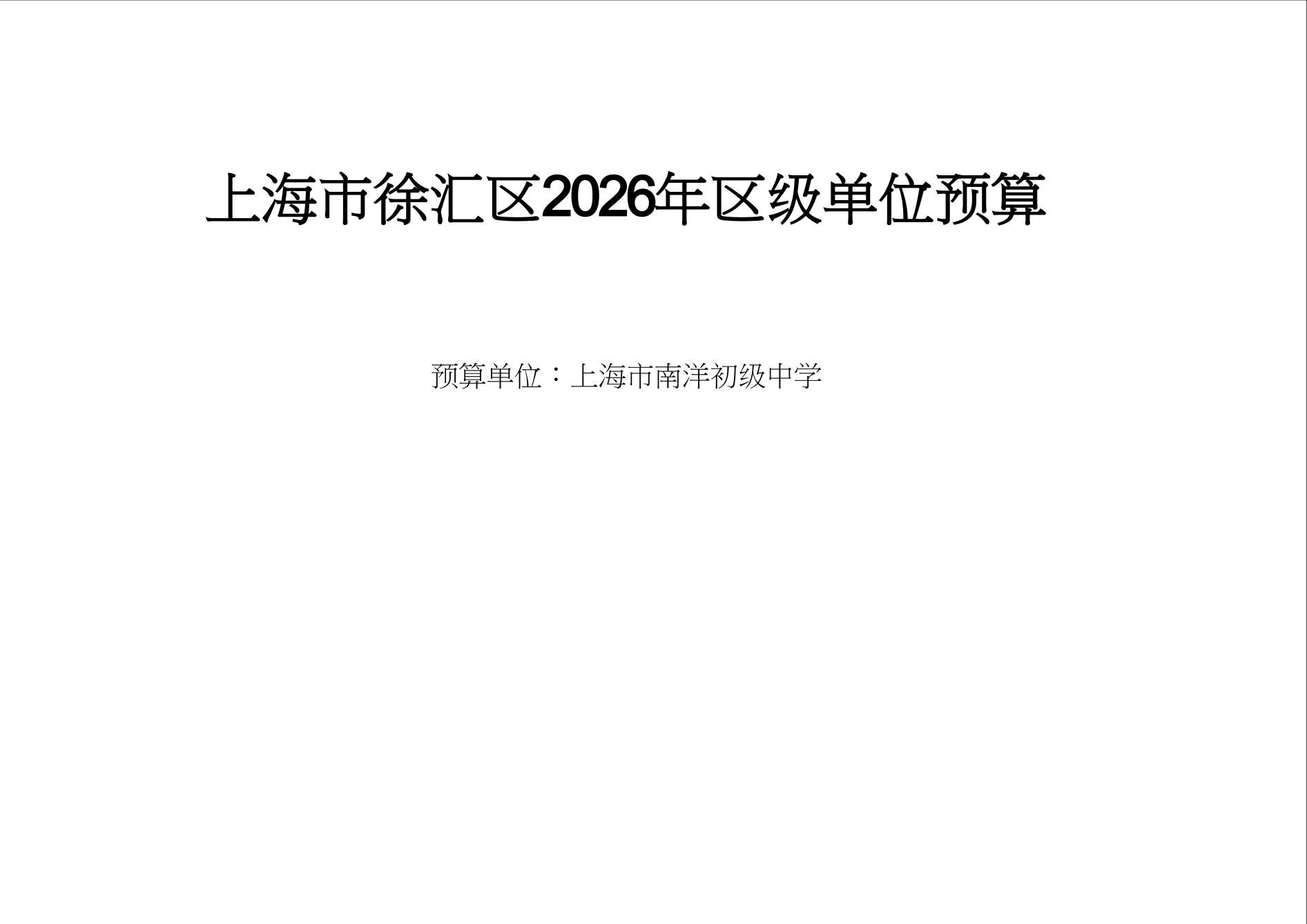 上海市南洋初级中学2026年度单位预算