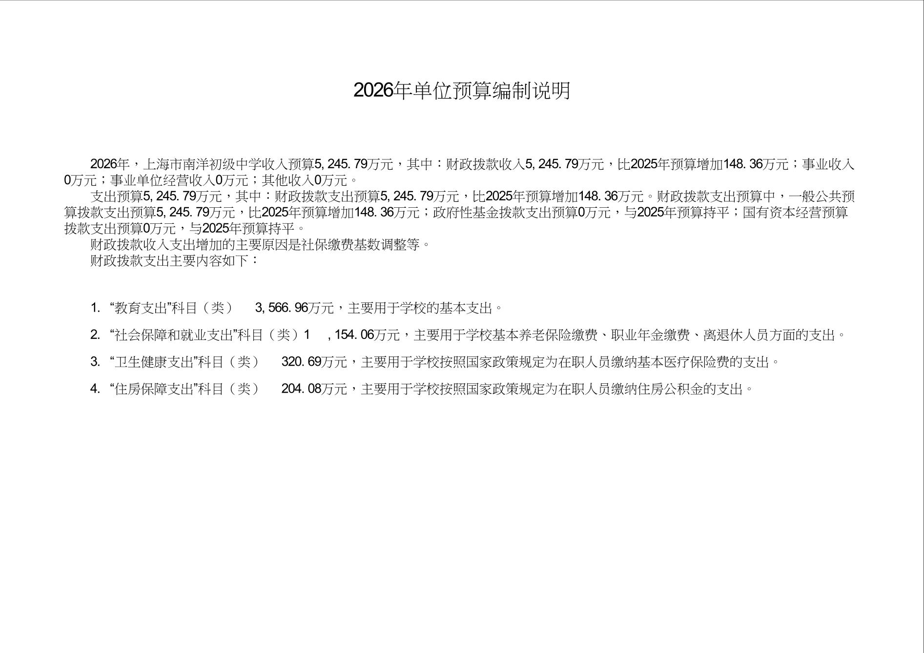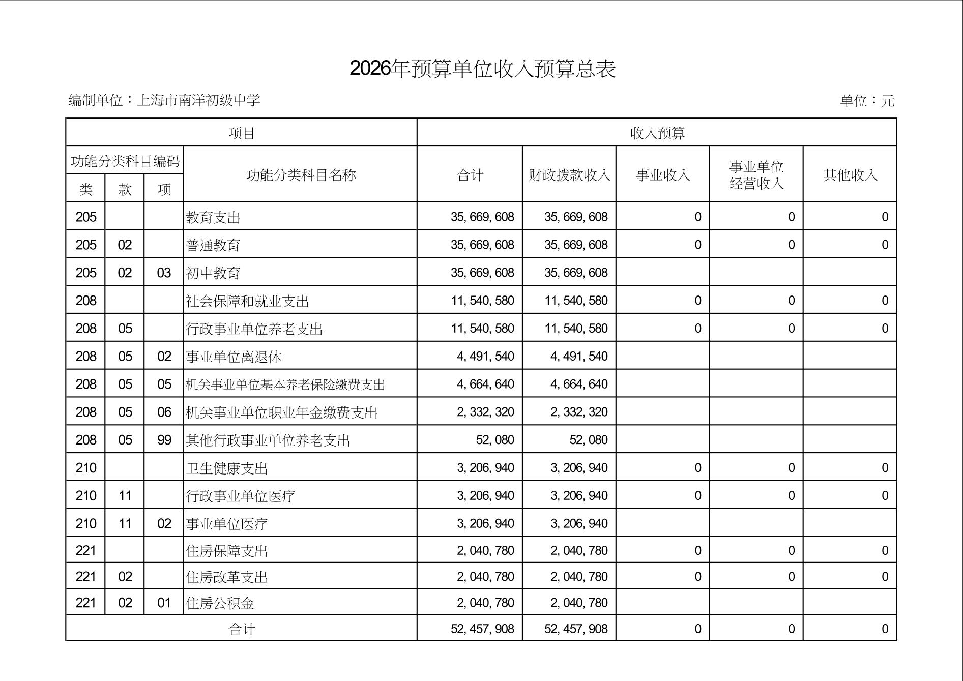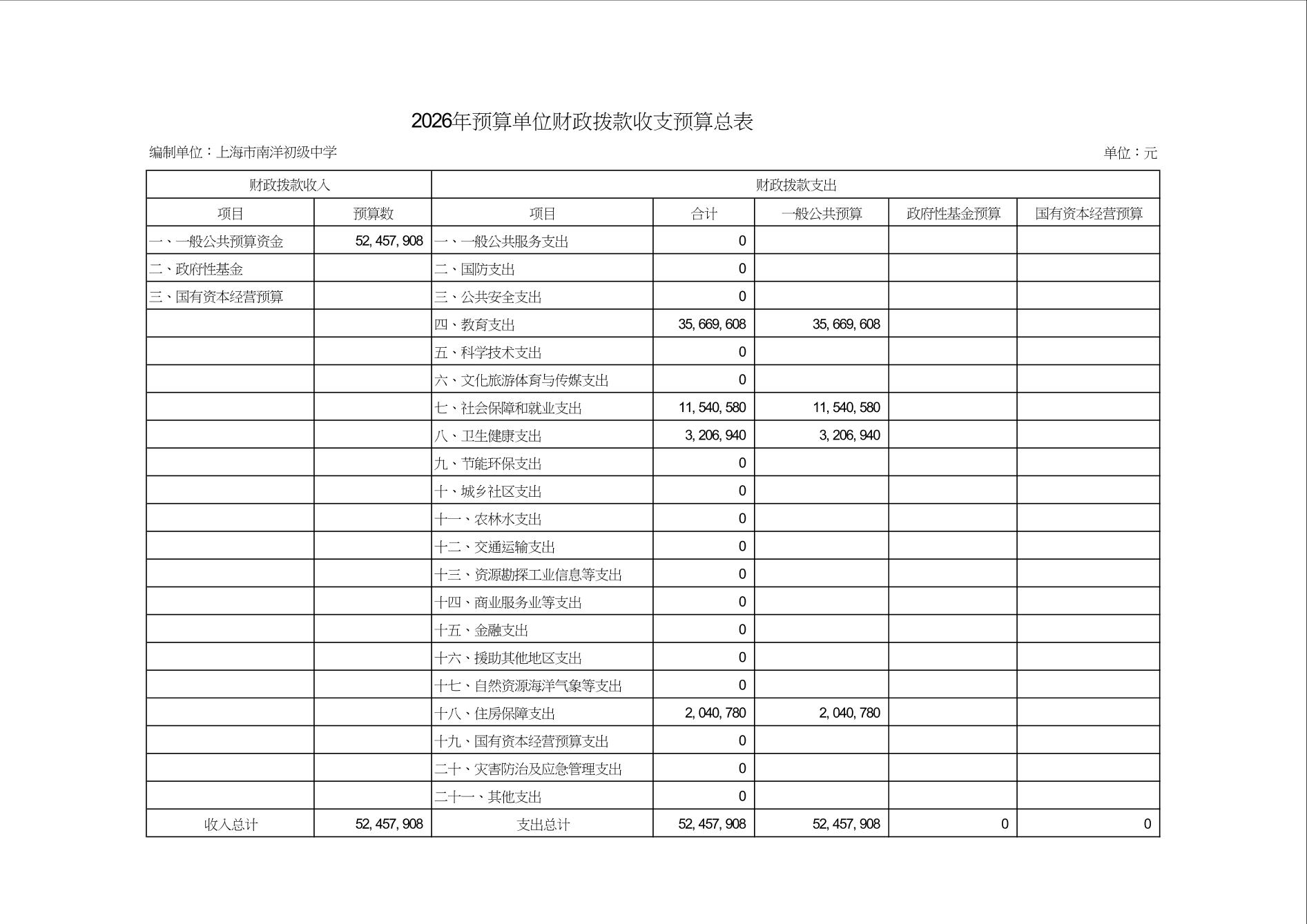 上海市南洋初级中学2026年度单位预算